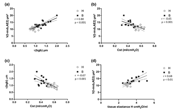 They are further able to find a negative correlation between the mean thickness of the blood gas barrier and quasi-static compliance (Figure 2). In contrast, tissue elastance (H) demonstrates a strong positive correlation with the volume of electron lucent multivesicular bodies; a specialized type of endosome that contains membrane-bound extracellular vesicles.