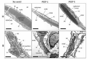During the initial week following instillation, bleomycin contributes to an acute lung inflammation response3. Krischer et al. employ this response in their most recent paper which examines structural changes in surfactant producing cells and the blood-gas barrier, across six experimental groups of rats. Experimental conditions start with a healthy (H) vs. bleomycin exposure (B) split. These groups are further split into 3 groups each: 2 groups with ventilation using Positive End Expiratory Pressures (PEEPs) of either 1 or 5 cmH2O or where no ventilation is done before data collection.